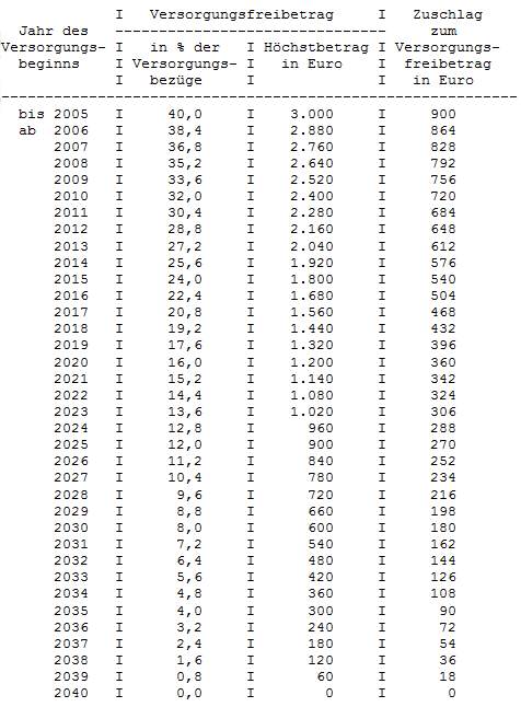 Der maßgebende Prozentsatz, der Höchstbetrag des Versorgungsfreibetrags und der Zuschlag zum Versorgungsfreibetrag sind der nachstehenden Tabelle zu entnehmen: